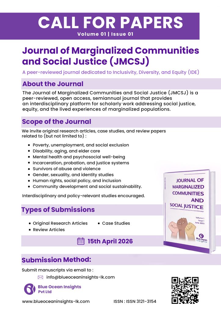 The Journal of Marginalized Communities and Social Justice (JMCSJ) was established in 2025 by Blue Ocean Insights Pvt Ltd, Sri Lanka. Created to amplify underrepresented voices, it serves as an inclusive academic platform promoting research, dialogue, and policy impact on issues of diversity, equity, and social justice.